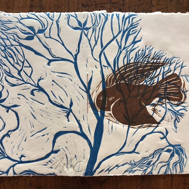 Linocut card (two matrices and two colours) on Graphia paper 270 gr. Internal insert for writing in Japanese rice paper, bond to contrasting thread. 11,5x16c. Envelope included.