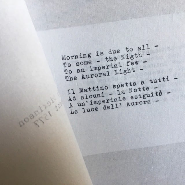 Linoleografia 16,5x17,5h cm. a più matrici stampata a mano su carta Graphia 270gr., accompagnata da un frammento poetico di Emily Dickinson battuto con macchina da scrivere Continental Wanderer del 1930 su carta giapponese. Insieme contenuto in una busta fatta a mano di cartoncino Fabriano Artistico non sbiancato. Tirato a 20 esemplari numerati e firmati.